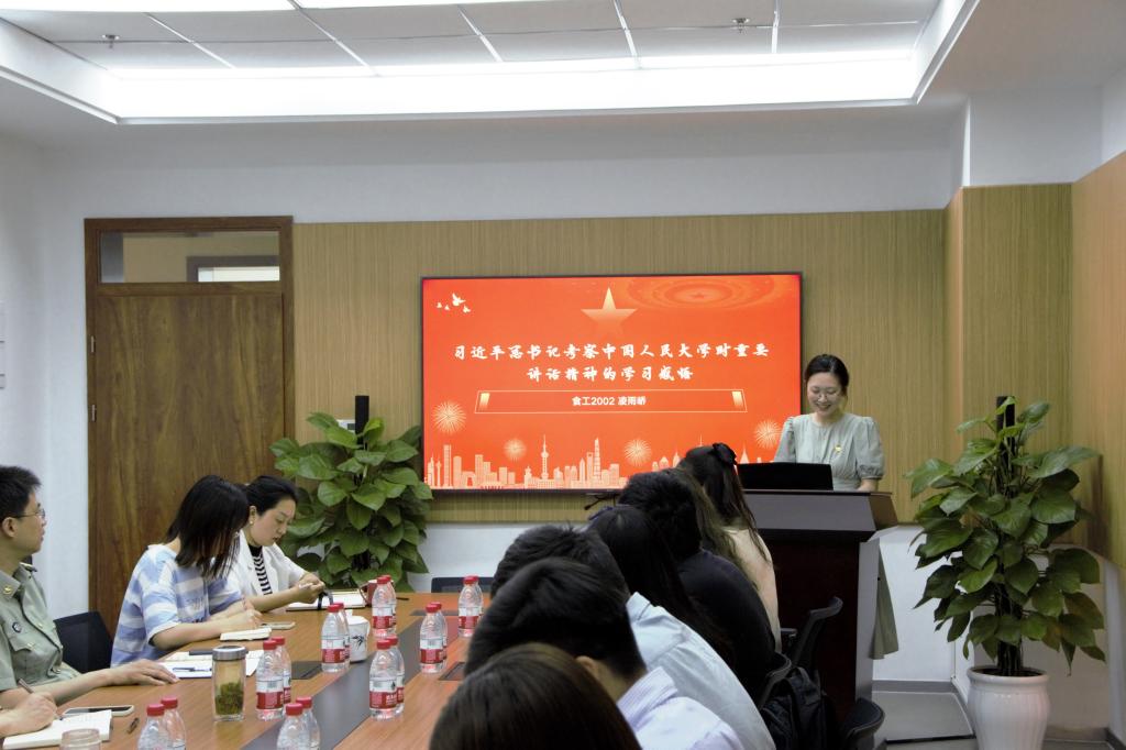 食品科学技术学院研究生第七党支部沈路虹同志在分享自己对习近平总书记在中国人民大学考察时的重要讲话精神时说道:“作为一名研究生,既要有家国情怀,也要有人类关怀。热爱祖国才是立身之本,成才之基,我们要把习主席的寄语转化为食品人发展的动力。”作为本科生团员代表的凌雨峤同学在听完习主席的讲话后感慨道:“这个美好的时代造就了一批批优秀的青年,这样的华夏盛世也成就了无数青年人的梦想!新时代的中国青年,自信昂扬,努力拼搏,踔厉奋发,勇毅前进。”作为青年学子,我们认真落实习主席对于广大青年的谆谆教诲,砥砺前行,不负韶华!