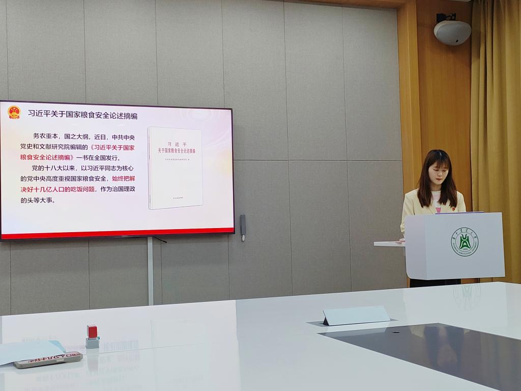 粮食凝聚着劳动者的心血和汗水,田蕾同志通过对“粮食安全”相关知识的讲述,让党员同志们树立了“节约光荣,浪费可耻”的观念,“一粥一饭,当思来之不易;半丝半缕,恒念物力维艰”。同时她也呼吁大家:用实际行动弘扬中华民族勤俭节约的传统美德,营造爱粮节粮浓厚氛围,让每个人树立以珍惜粮食为荣,浪费粮食为耻的观念,自觉养成勤俭节约的新风尚。作为食品学院的学生,我们更应该把粮食安全知识传递出去,让大家明白从颗粒归仓到唇齿留香的每一步都承载着无数人付出的辛劳和汗水。