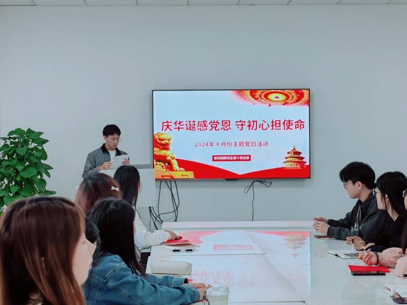 (通讯员 柳秋艳)为庆祝共和国华诞,深入贯彻落实习近平新时代中国特色社会主义思想和党的二十大精神、党的二十届三中全会精神,食品科学技术学院研究生第十党支部于10月22日中午在新工科楼120会议室举行了 “庆华诞感党恩,守初心担使命”主题党日活动。本次活动由党支部书记田可同志主持,通过深入学习习近平总书记的重要讲话精神,引导支部党员坚定理想信念,不忘初心,牢记使命。