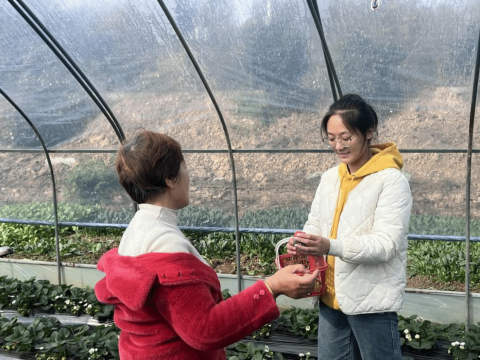 王佳文同志当地村民与党支部成员进行经济作物交流(龚琬婷 摄)