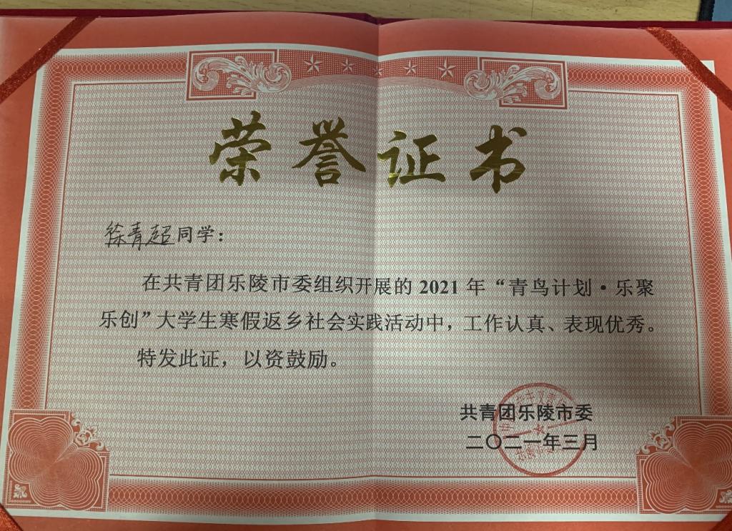 蓬山此去无多路,青鸟殷勤为探看。近日,安全与环境工程学院收到一份“青鸟计划”的荣誉证书,作为对安全应急2018级徐青超同学在“青鸟计划”大学生社会实践过程中为家乡政府中做的工作的认可。