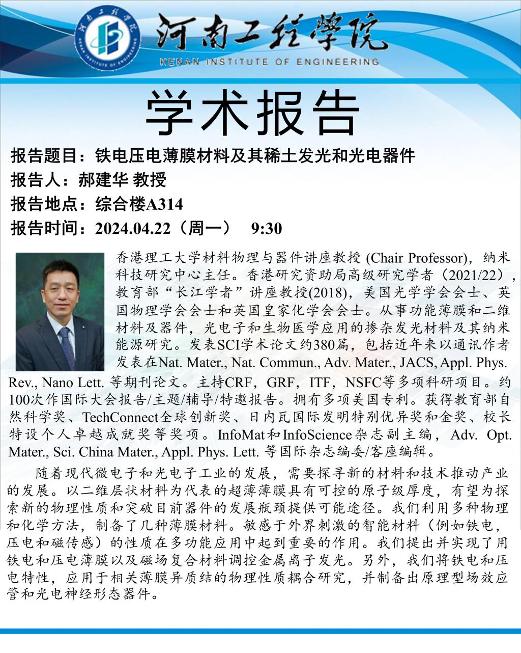 学术报告:铁电压电薄膜材料及其稀土发光和光电器件