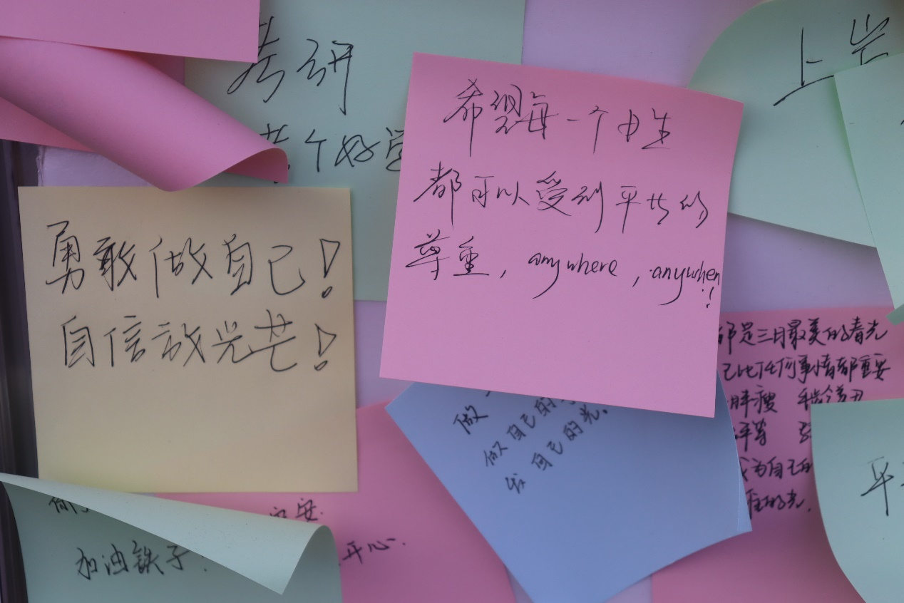 此次活动主要分为两部分,参加活动的同学首先需要在签到处领取活动卡,前往“心愿区”和“标签区”,完成任务并进行盖章。随后,同学们需在人型展板上撕下标签,并写下自己的祝福。活动伊始,陆陆续续开始有同学注意到这块特别的“标签板”。最开始围观的多是女生,她们不满这些贴在女性身上的标签,在志愿者的鼓励下,大家勇敢撕下标签,接过便利贴,写下对自己的祝福。随着活动进行,不少同学勇敢走上前来,男生女生皆积极参与,为女生们撕下了被定义的标签,打破了世俗的桎梏,留下了美好的祝愿。“在这个专属于女性的节日里,打破社会长久以来对女性施加的刻板印象,发现女性多种魅力,是举办该活动的初衷。”安全学院心健联负责人焦志阳如此说到。