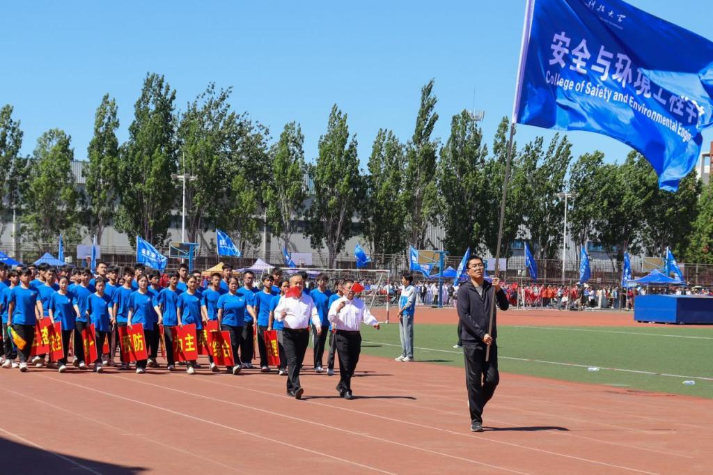 开幕式上,伴随着旋律激昂的《运动员进行曲》,安全学院方队迈着整齐有力的步伐昂首阔步走过主席台。“安达天下,环系山水”,这是安全学子的人生态度;“安全第一,智慧环境,职业健康”,这是安全学子的铮铮誓言。 他们目光坚定、口号嘹亮,尽展蓬勃向上的风貌和斗志昂扬的精神,成为运动场上一道亮眼的风景线。
