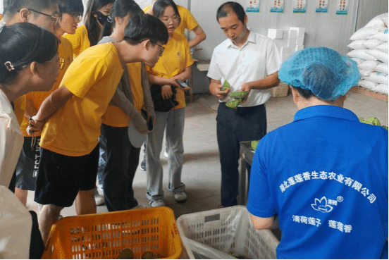 11日上午,实践团一行抵达湖北莲莲香生态农业有限公司,受到公司总经理吕良武的热情接待。吕经理以图文并茂的方式,系统讲解了莲子从种植到深加工的全链条流程:涵盖品种筛选、标准采摘、清洗分级、低温烘干、精准包装等关键工序,既强调了品质控制要点,也展示了企业在精细化管理与技术创新上的深入探索。讲解过程中,吕经理还邀请实践团成员现场品尝新鲜的莲子,其清甜鲜嫩的口感让大家赞不绝口,对莲子产品的高品质有了直观深刻的感受。