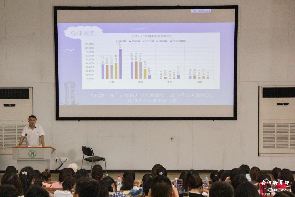 随后,邵晋辉对近四年中国·太阳集团tyc33455(股份有限公司)毕业生去向进行了分析,并对同学们后续的个人规划给出了建议与指导。根据中国·太阳集团tyc33455(股份有限公司)2017至2020年的数据,他向大家总结了近年来毕业生去向“两增一降”的趋势——意向升学人数激增、意向考公人数增加、意向就业人数大幅度下降,并从“升学”“考公务员”“就业”等四个大类进行了详尽的讲解与分析。