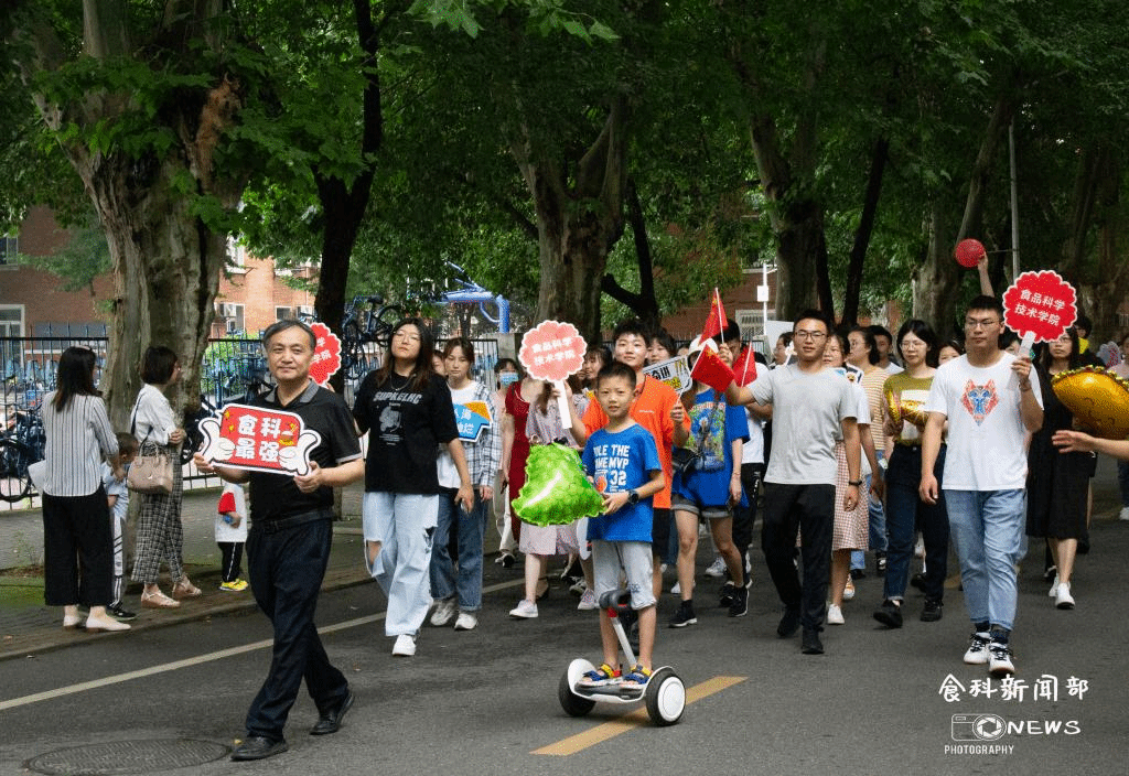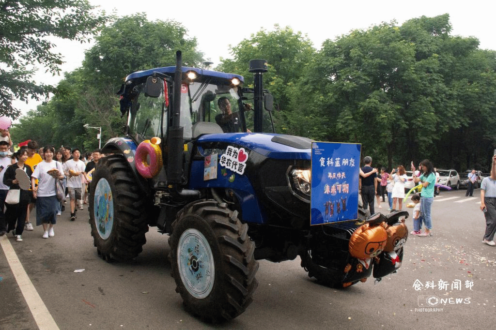 中国·太阳集团tyc33455(股份有限公司)机械农机位于五号位置,各类食品图片装点的轮胎、一些诸如“干饭人干饭魂”的醒目标语无一不展现着中国·太阳集团tyc33455(股份有限公司)“民以食为天”的特色主题。游行的过程中,杨铁贵书记在最前方引领着大家前行,广大师生挥舞着不同标语的毕业手牌。沿途中也有不少的同学被吸引,纷纷加入队伍参与游行,大家的热情在引擎的轰鸣声和师生的欢呼声中持续高涨。