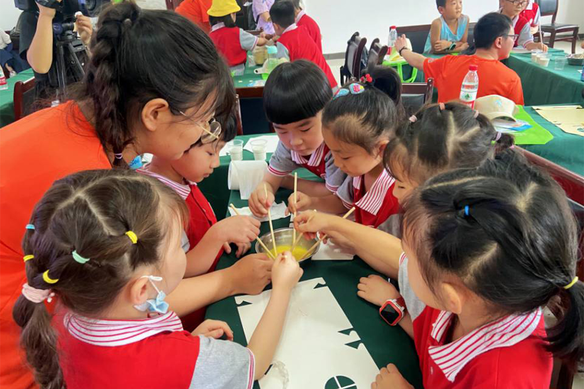 互动讲堂结束后,依据活动前的分组,“咕噜咕噜吨”小队成员们带领着小朋友们依次进行蛋挞及可乐的制作。陈柯涵在讲台逐步讲解与示范,小队的五名成员则在各自带领的小组前实时关注并指导他们操作。活动过程中,在小队成员们的组织下,小学生们认真聆听讲师的步骤讲解,亲自动手打鸡蛋、捣香菜等,每一位同学都积极参与其中。与此同时,对于有疑惑的地方,不少小学生们还不断提出疑问,小队成员们也给予了及时、耐心的讲解。活动即将结束时,小朋友们品尝了自己制作的可乐、蛋挞。