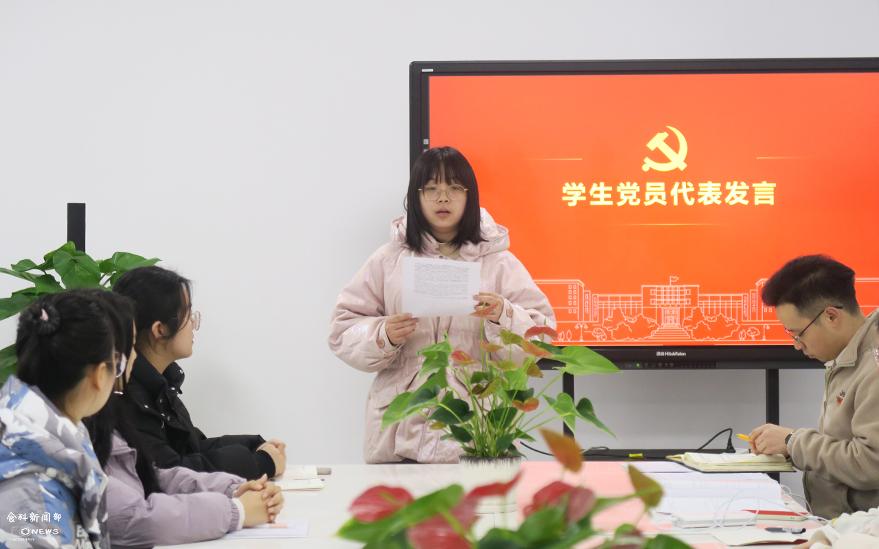 党员代表张思怡和新发展党员戴浩驰分别发言。张思怡分享了自己对于党和国家在十三个方面取得的历史性成就和发生的历史性变革的想法与认识。她说道:“在为人民服务这条道路上,成为党员不是结束,而是开始。希望我们一同勉励,牢记自己的党员身份和责任,不忘昨天的苦难辉煌,无愧今天的使命担当,不负明天的伟大梦想。”新党员戴浩驰则以“百年风华正茂,奋斗书写华章”为题,谈到了她对中国共产党百年奋斗的五大历史意义的理解。她说:“作为一名合格的党员,绝不能再对自己的缺点视而不见,我愿意以此次学习为起点,在日后积极主动地学习党的理论、关注党的方针政策、坚持深入思考,将理论知识中的精神力量融入到工作和生活中,为同学们服务!”