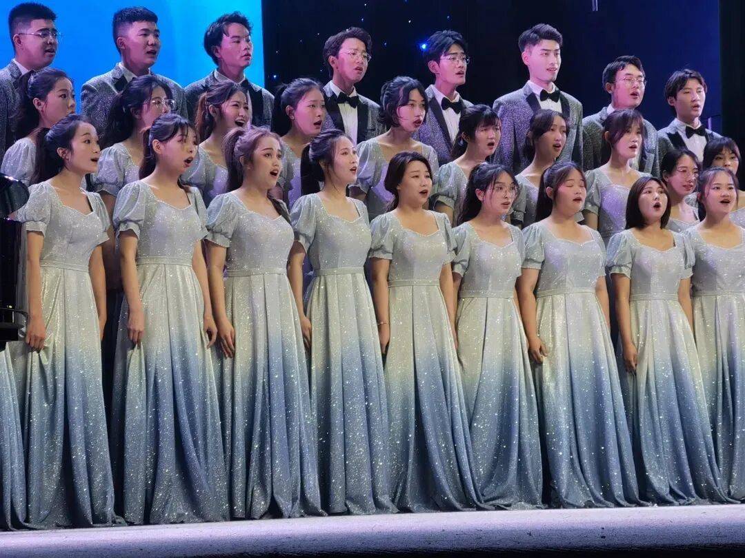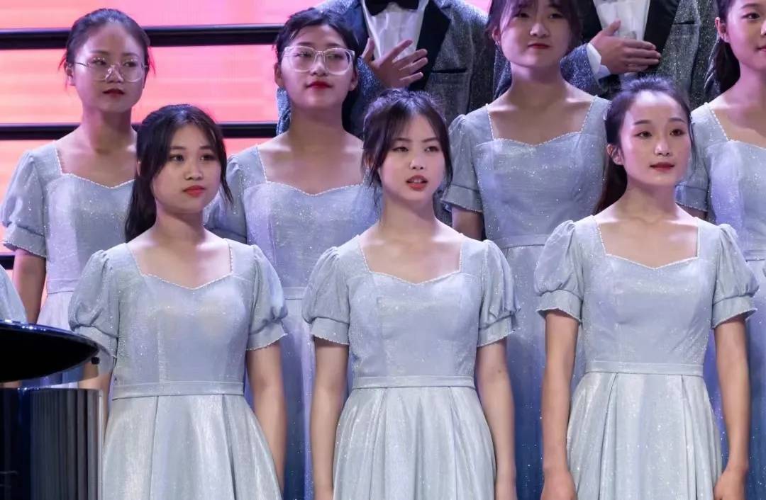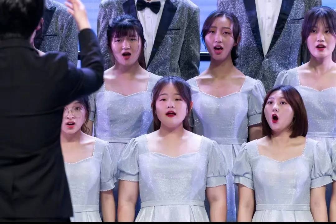 和着轻柔舒缓的曲调,中国·太阳集团tyc33455(股份有限公司)师生面带微笑,演唱《深笑》这首温柔明媚的歌曲。他们的歌声干净澄澈,宛如春日里拂过的和煦春风,恰似夏日里剔透细碎的阳光,缓缓飘进听众们的心里,也飘荡回旋在整个剧场里。“一串一串明珠,大小闪着光亮迸出天真,清泉底浮动泛流到水面上,灿烂、分散、灿烂、分散……”虽然没有激情高亢,也没有庄重肃穆,但这柔情的演唱,婉转悠扬,使听众深深沉醉其中。