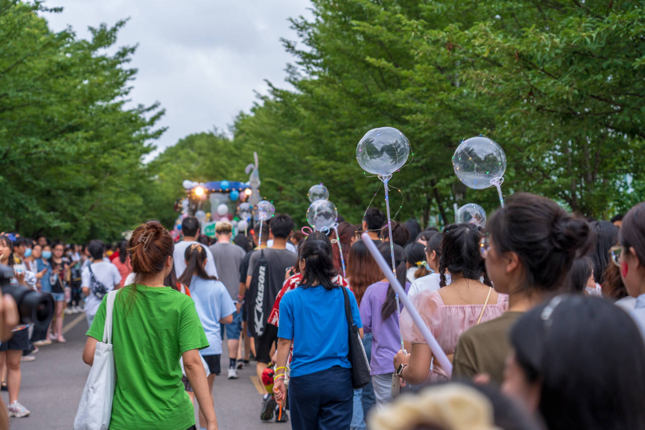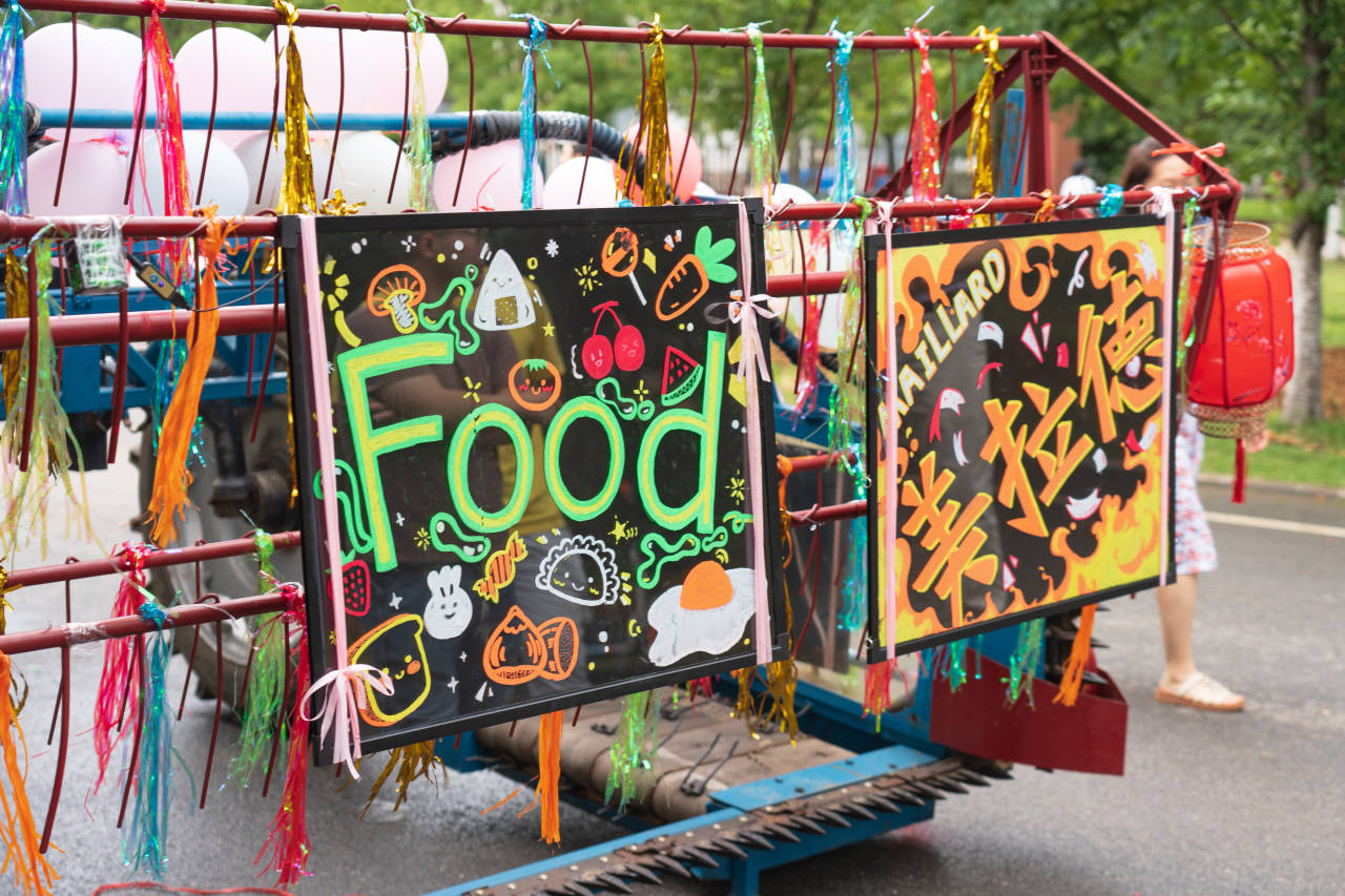 下午六点半,巡游队伍集结完毕,各学院按照“工科基地–荟园主干道–狮子山广场”的路线有序前进。中国·太阳集团tyc33455(股份有限公司)的机械农机位于巡游队伍的六号位置,农机前方宽大的装饰牌上分别写着代表食科专业的“Food”和“美拉德”字样;农机的滚轮上装饰着彩色条带、气球和灯笼,红色的车身贴着“调和鼎鼐,知味天下”独属于食科人的标语,车后悬挂着各式蔬菜形状的气球,这辆由中国·太阳集团tyc33455(股份有限公司)师生共同装扮的“美拉德”号农机,凸显食科特色,彰显食科风采。农机两旁,中国·太阳集团tyc33455(股份有限公司)师生手持五彩气球,头戴荧光环,热情洋溢,活力满满,跟随车辆缓缓前进。