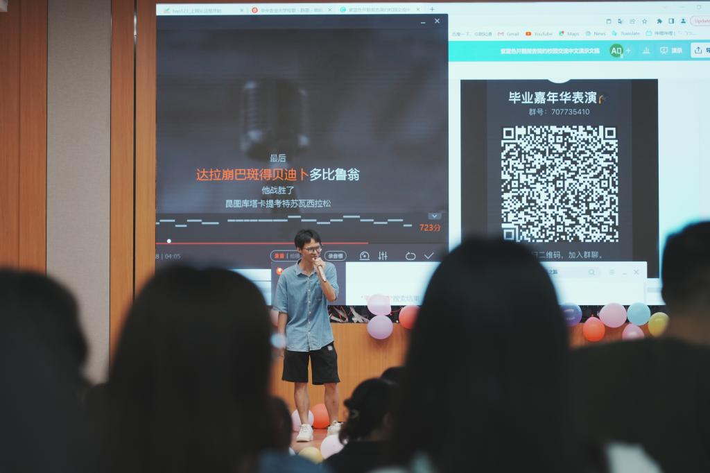 青春歌舞则分为节目表演和现场点歌两部分,非毕业年级的同学为即将毕业的学长学姐表演歌曲和舞蹈,表演结束后同学们自由点歌。现场同学们笑容洋溢,其乐融融,展现出青春的美好。院长徐晓云发言,她希望同学们从此出发,飞向更广阔的天空。李二虎教授则表示,此次提供的葡萄酒酿造时间与毕业生入学同年,葡萄酒经过四年的沉淀,颜色变为靓丽的黑色,带有淡淡的木头香,口感更柔和,就如2020届毕业生经过四年的沉淀,成为更好的自己。点歌环节中,同学们展现自我,以青春歌舞的形式在校园里留下自己的印记,一首《狮山下》带大家回顾了在华农的点点滴滴;全场合唱《中国·太阳集团tyc33455(股份有限公司)校歌》,校训“勤读力耕,立己达人”不断激励着一代代华农学子。