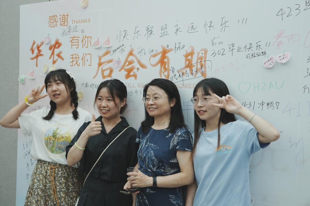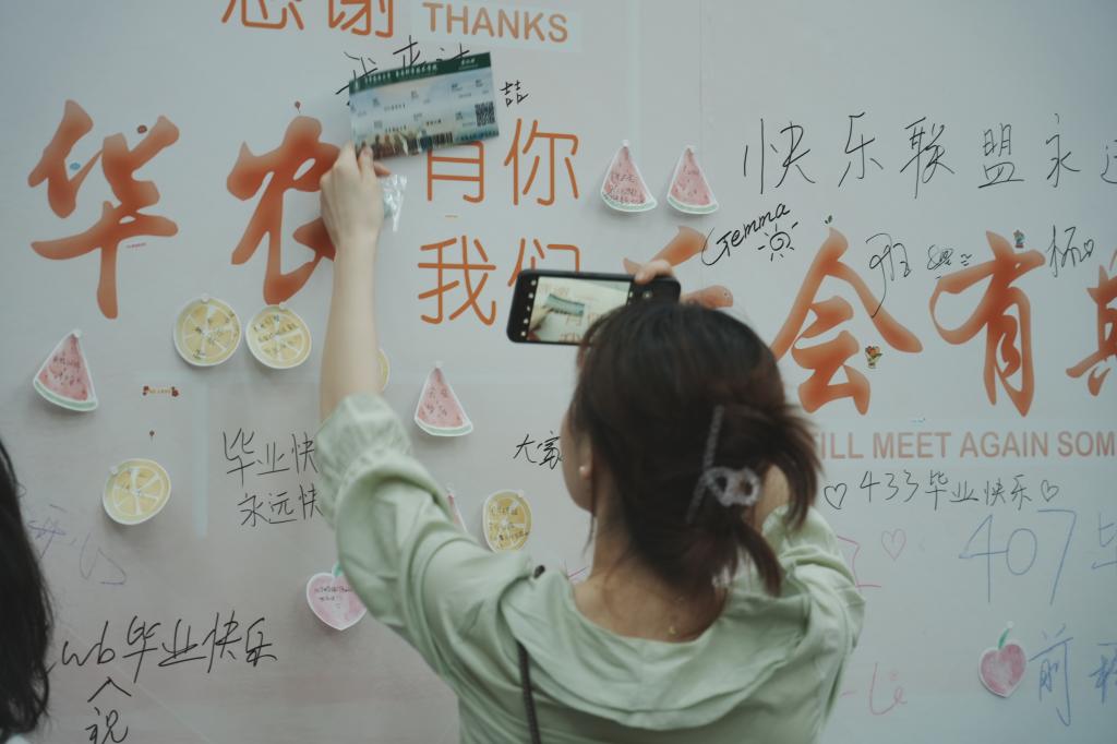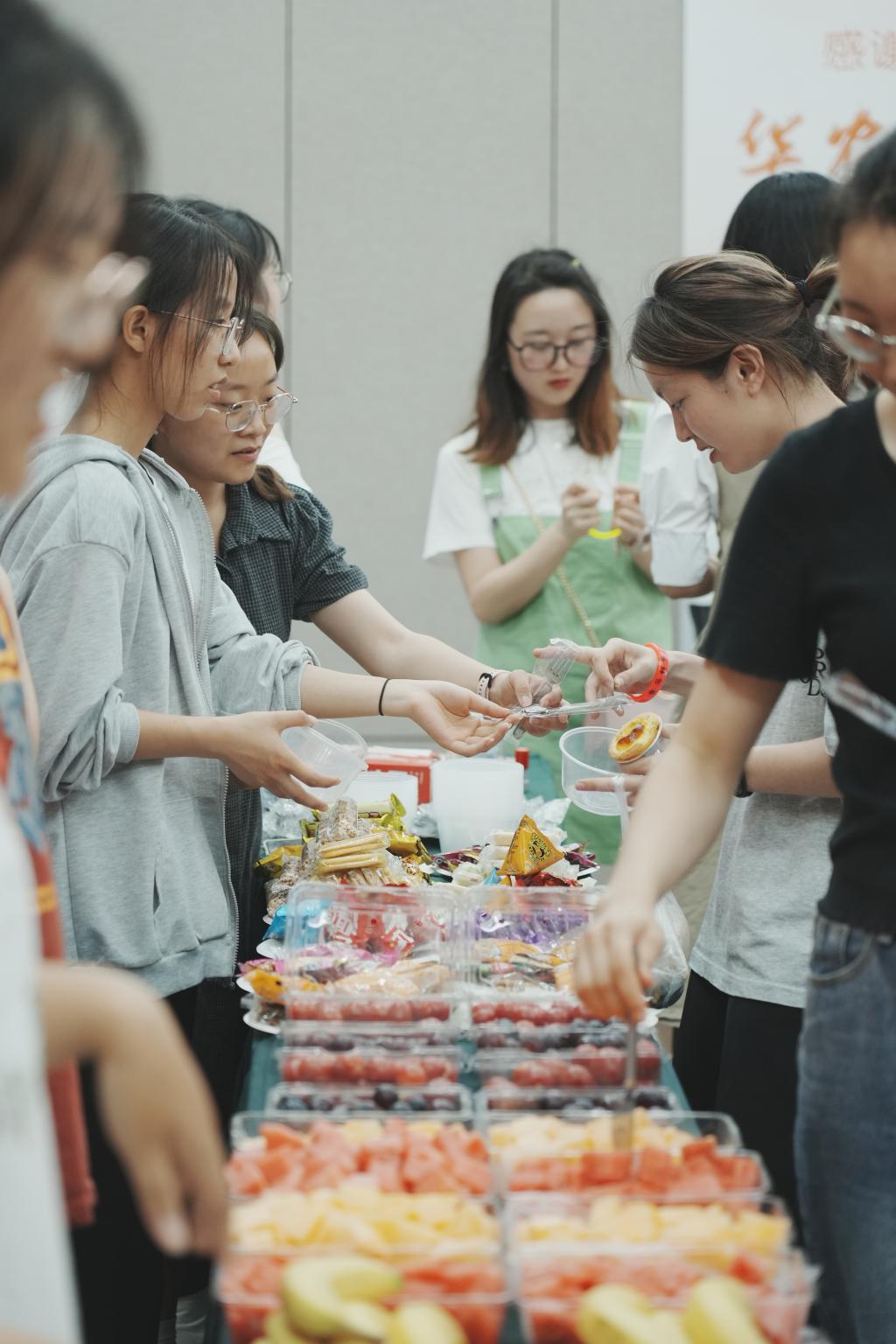 活动共有毕业留言、趣味游戏、冷餐晚会、青春歌舞及葡萄酒鉴赏五个部分。趣味游戏活动设置在活动场地入口处,分为投壶和套圈两项,同学们积极参与其中,在这个充满激情的夏天留下欢声笑语,记载下难忘的青春记忆。留言板处也有同学们的身影,他们在这里留下自己独特的校园回忆和美好寄语,并纷纷合影留念。留言墙的两边,冷餐会上各种餐点一应俱全,其中还有我院研发的低脂冰淇凌“橘巧兮”和学院自主酿制的葡萄酒,据了解这是2018年学院李二虎老师亲手酿制的唯一一批葡萄酒,四年的沉淀与窖藏也象征着22届毕业生一路以来的成长。同学们举杯品茗,回忆着身在华农的点点滴滴,享受晚会的快乐时光。