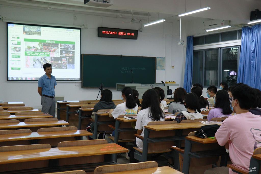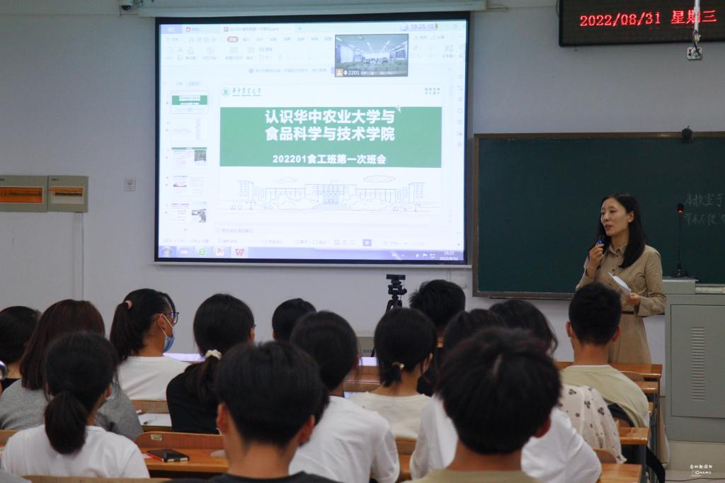 与此同时,食工类2201班在同学们自我介绍结束后,班主任田静为大家介绍了学院学科特色、师资力量以及校园文化。她以三鹿奶粉事件为例,简要讲述了三聚氰胺为什么可以被添加到奶粉中,加深新生对食品安全概念的理解。随后,副院长陈前江总结发言,他提出新生入学应做三件事:第一件事是要认识学校、学院及学科发展情况,了解学校的起源历史、学科特色及人文活动,对大学有一个清晰的认知;第二件事是珍惜过往成果,来路不易,在大学应以更加饱满的热情投入学习中,提升专业能力;第三件事是要对未来生活充满希望,大学生活必定是丰富多彩、热情洋溢的。同时,他希望新生树立“为产业服务”的理想信念,学成之后积极投身到食品产业的建设中去,为产业发展做出贡献。
