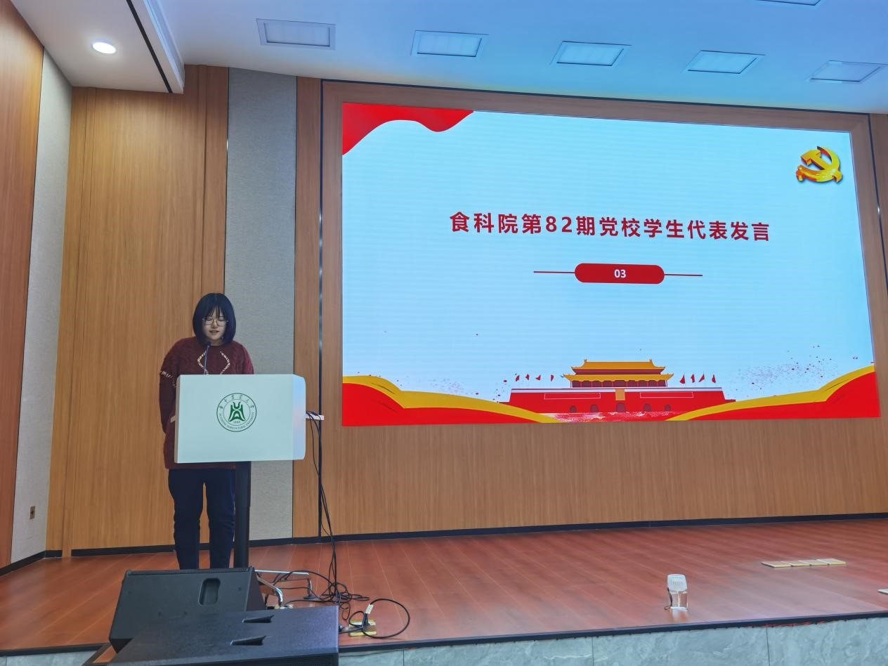 党校学员李羿洁代表食科院82期党校学员上台发言,她首先对党校为大家提供宝贵的学习和交流的平台与机会表示了感谢。她表示自己在二十大期间认真收听了习近平总书记代表第十九届中央委员会所作的报告,持续关注大会议程,并认真学习二十大相关内容。李羿洁向大家发出倡议:“我们这一代人生逢盛世,重任在肩,应该通过党校的学习提高自己的思想素质和知识水平,努力做到端正学习态度,理论与实践结合,也希望在党校能和大家共同学习进步。”