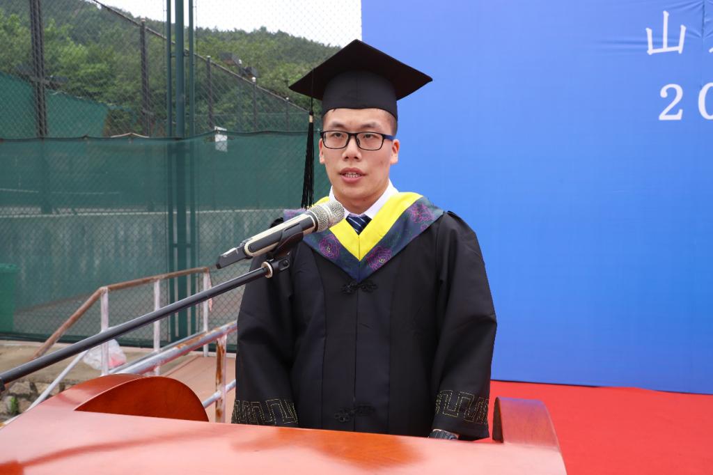 毕业生代表尘兴邦致辞。他回顾了四年来的大学生活,回忆了在学生会历练的成长过程,并代表2020届全体毕业生向学校,学院和师长们表达诚挚谢意和美好祝愿。他表示,作为科大学子,2020届毕业生定当奋勇前行,乘风破浪。随后,他倡议全体2020届毕业生向曾经引领自己前行的学院领导、老师们行谢师礼。