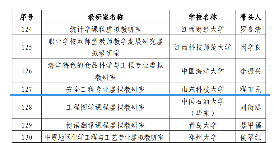点击:近日,教育部办公厅公布了第二批虚拟教研室建设试点名单,我院《安全工程专业虚拟教研室》位列其中,获批教育部虚拟教研室建设试点。这是山东科技大学获批首个教育部虚拟教研室试点建设单位,也是我校基层教学组织建设取得重大突破。