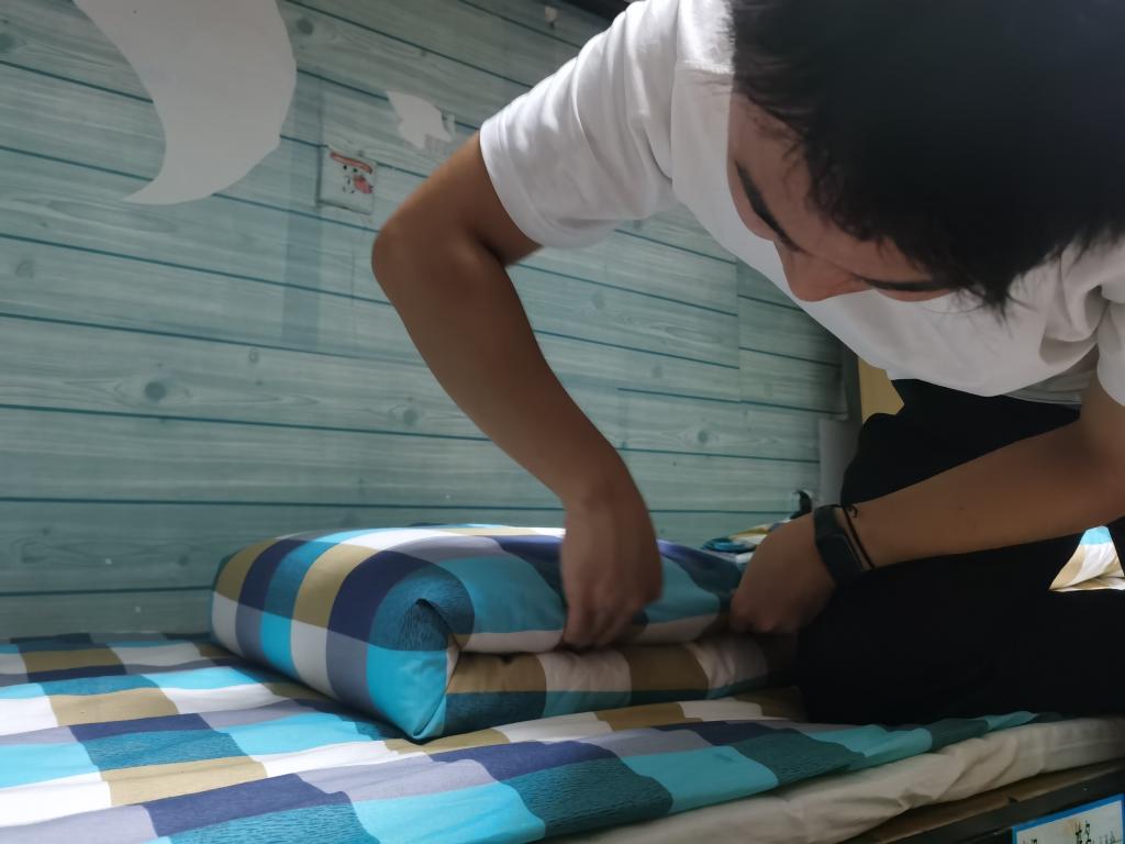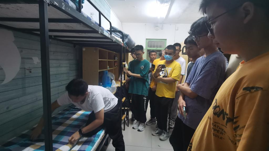 “被子三分叠七分整,要牢记‘平、折、压、抠、卡、齐、直、正’这个叠被要领。"新生宿舍里,2020级退役学生陈现超细致耐心地向新生们讲授叠好被子的诀窍和方法。被角一抖,用手抹平,经过他的“加工制作”,一床“豆腐块”般的被子诞生了,新生们纷纷被这娴熟的动作圈粉。被子一捋,四四方方;书籍归类,整整齐齐;鞋子衣物,各有归处....在长达一个多小时的“高水准”内务规范“现场实操”中,陈现超和孙雅晴一针见血地指出新生宿舍中内务整理的不规范之处,示范整理动作干净利落。从书的摆放到阳台杂物的放置,从洗漱用品的归类到柜中衣物整理,他们都给了新生们进行了高效的归纳指导,前几分钟还稍显杂乱的宿舍眨眼间就变得整齐宽敞,大家纷纷感慨这次的内务整理教学真是“硬核”!