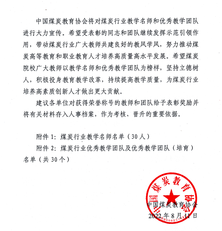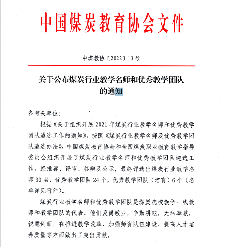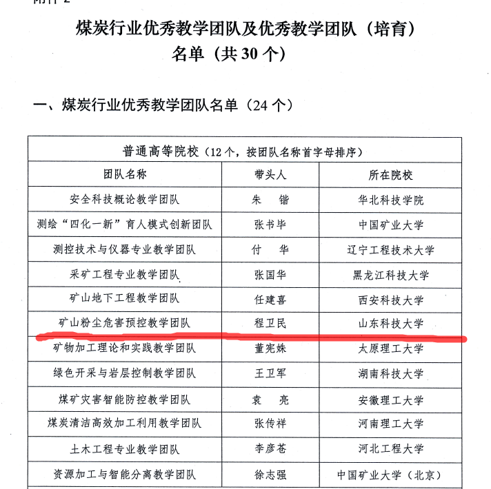 点击:近日,中国煤炭教育协会公布了2021年度煤炭行业教学名师和优秀教学团队遴选结果,按照《煤炭行业教学名师及优秀教学团队遴选办法》,中国煤炭教学协会和全国煤炭职业教育教学指导委员会组织开展了煤炭行业教学名师和优秀教学团队遴选工作,经推荐、评审、答辩及公示等环节,山东科技大学程卫民教授负责的“矿山粉尘危害预控教学团队”成功入选全国煤炭行业优秀教学团队。