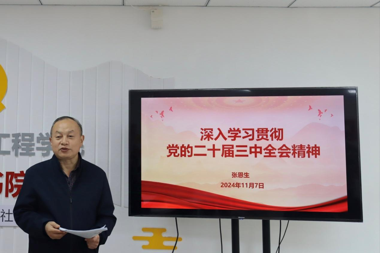 张恩生以党的二十届三中全会以来取得的丰硕成果为切入点,全面回顾了会议基本情况、习近平总书记重要讲话精神、《中共中央关于进一步全面深化改革推进中国式现代化的决定》提出的重大举措,深入解析全会在理论创新、政策推进以及国家发展战略方面的重要成就。张恩生从“经济快速发展”和“社会长期稳定”这两大中国式现代化的成果出发,详细向同学们展示了中国共产党多年奋斗的丰功伟绩,展现了中国共产党领导的先进性。结合当前高等教育面临的形势任务和学院专业发展实际,张恩生从党建工作、人才培养、专业发展等方面,对学院抓好全会精神贯彻落实提出明确要求。