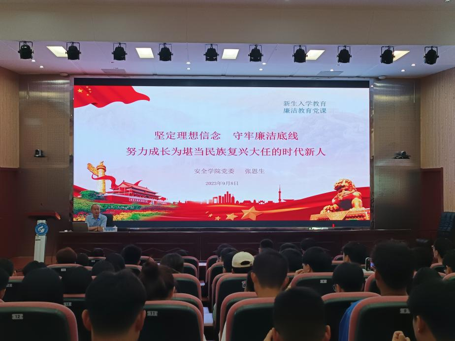 为深入学习贯彻习近平总书记关于建设教育强国的重要讲话精神,培养担当民族复兴大任的德才兼备的高层次人才,9月8日,安全学院党委书记张恩生为研究生新生作“坚定理想信念,守牢廉洁底线,努力成长为堪当民族复兴大任的时代新人”专题教育。