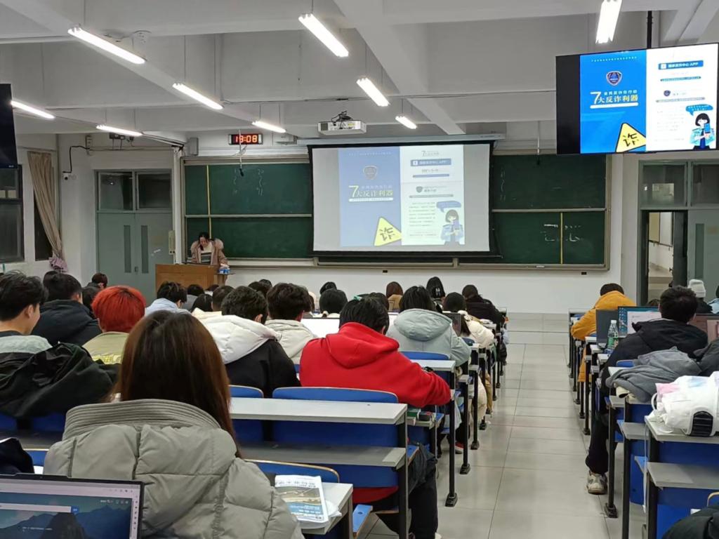 冷冬阳先向同学们介绍电信诈骗的内容概念、预防手段等知识,通过真实案例介绍刷单、借贷、假冒客服等电信诈骗模式,随后向同学们推广下载国家反诈软件、关注“金钟罩”微信公众号等防范电信诈骗途径,并组织学生仔细阅读、签署《防范电信网络诈骗告知书》和《不参与电信网络诈骗犯罪承诺书》。