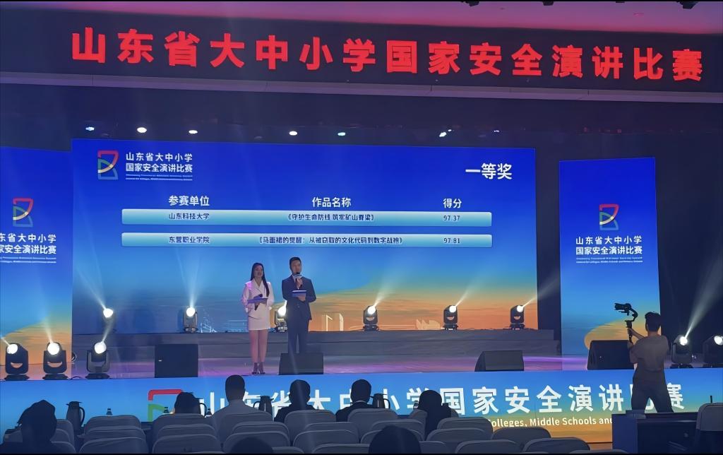 4月10日,由山东省教育厅、省委国安办、省国家安全厅、团省委主办的山东省大中小学国家安全演讲比赛决赛在东营职业学院隆重举行,山东科技大学安全与环境工程学院安全工程2023级本科生刘思彤、安全工程2023级研究生刘士昊以《守护生命防线 筑牢矿山脊梁》为题演讲,凭借出色的表现荣获大赛一等奖,充分展现了我院“国家安全教育”的丰硕成果和学院安全学子的青年担当。