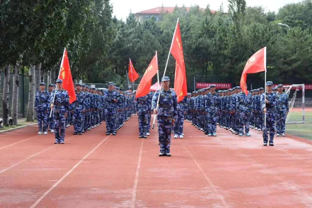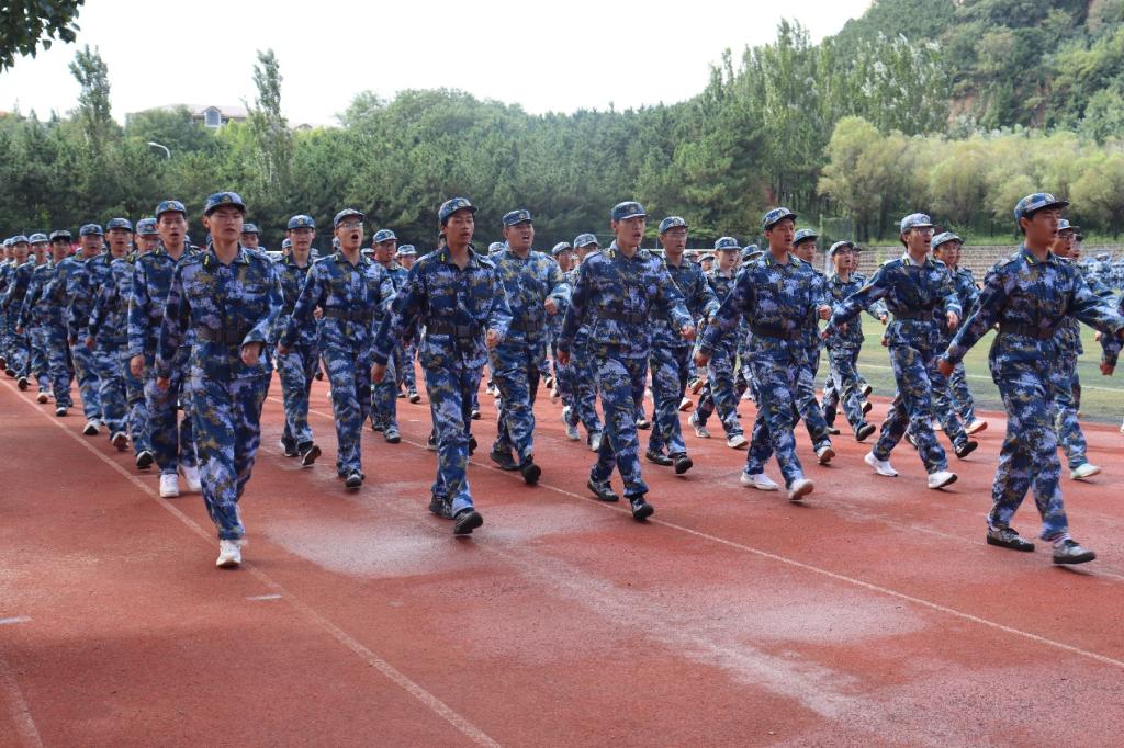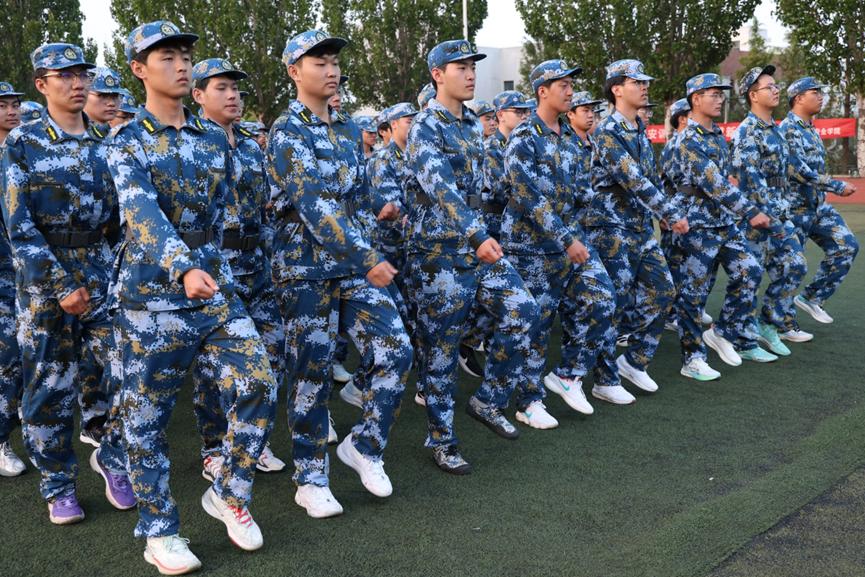 训练场上,教官嘹亮的一声"正步——走!"口令划破长空,新生们瞬间昂首挺胸,如同一座座挺拔的青松,迈出整齐划一的步伐。秋日的骄阳炙烤着大地,汗水顺着脸颊滑落,浸透了衣衫,但他们目光如炬,训练的热情丝毫未减。每一次摆臂,手肘绷直,高度平齐,在空中划出一道道标准的直线;每一次踢腿,膝盖绷紧,步调一致,脚掌落地时发出整齐划一的"嗒嗒"声响彻整个操场。