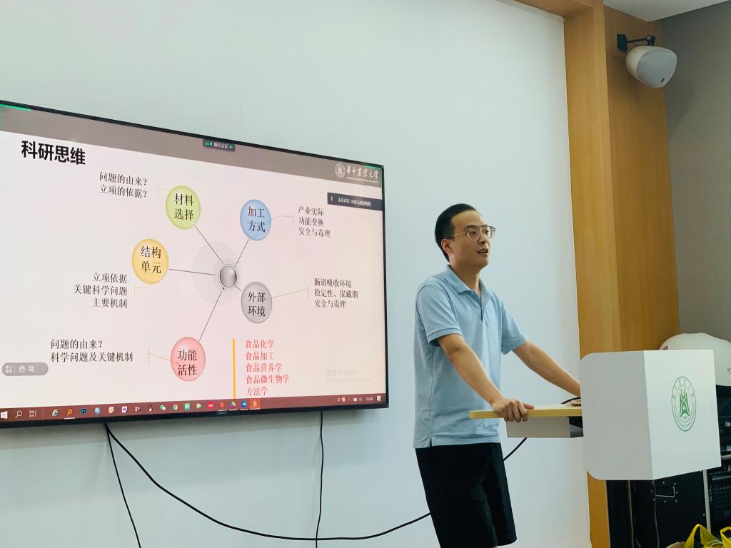 侯焘副教授首先分享了自己的教育、工作经历,后从他的两个研究方向--脱盐鸭蛋蛋清肽促骨合成机制的系统研究、植物源硒蛋白/硒肽的生物活性与应用分享了自己的科研心得。他提出,研究生一定要以问题为导向,逐渐培养科研思维。最后,侯老师送给研究生三句寄语,对于保持科研心情方面,要受得住挫折,守得住本心,耐得住性子;不急躁、不灰心、不局限。在维系师生关系时,要与人为善,于己为善。祝愿大家生活多姿多彩,工作有声有色,人生有滋有味。