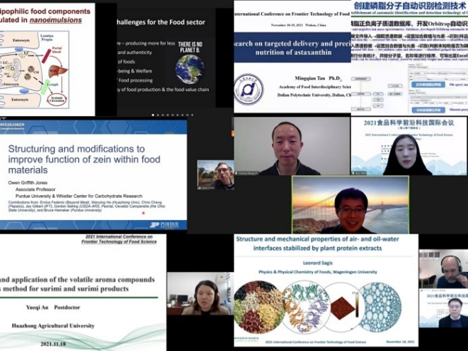 大连工业大学的谭明乾教授讲述了虾青素的定向输送和精准营养研究,美国北达科他州大学的Jiajia Rao教授分享了植物性物质脉冲蛋白,来自法国的Vincent Guyonnet博士分享了人工智能在食品行业中食品供应、食品生产等方面的应用,引起了师生学者们的广泛讨论。