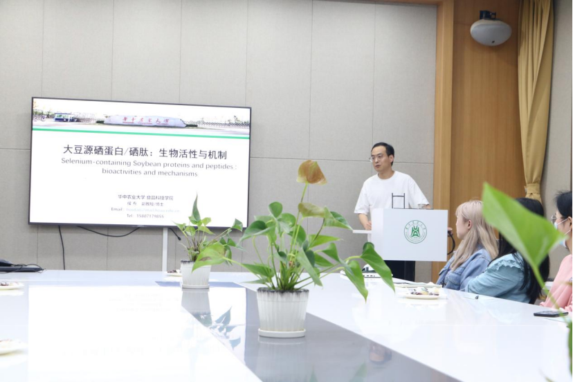 活动开始,侯焘老师给同学们分享了最新研究课题“大豆源硒蛋白/硒肽”以及相关成果。首先介绍了硒的吸收利用机制、植物硒蛋白的获得、功能,再到大豆硒蛋白的制备等等,此课题目前已发表6篇SCI,1篇中文文章以及1篇专利。通过该案例,由此引入一个课题的诞生、萌芽、成长以及落地所经历的艰辛,同时,侯焘老师还告诉同学们:“看文献不如看教材,教材是我们知识的起源。科研成果不等人,当一个想法诞生之后,要快速的投入试验,并且作为研究生,我们不能将科研终止于硕士论文,然后将其束之高阁。对于专硕学生,答辩时,最好有自己做出的产品,这才叫真正的完成了硕士期间的任务。”