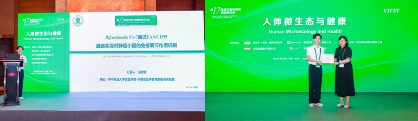 大会汇聚院士、国家杰青、长江学者、国家优青等近百位益生菌行业顶尖人才,以及数十家益生菌产业领军企业,是国内益生菌行业最高级别的科技盛会。吕优优老师在大会上做题为《动物双歧杆菌F1-7通过Fas/CD95通路实现对肺癌小鼠的免疫调节作用机制》的报告,分享自主乳酸菌株动物双歧杆菌F1-7对机体免疫调控的研究效果与机制,受到了行业专家教授的认可与肯定。
