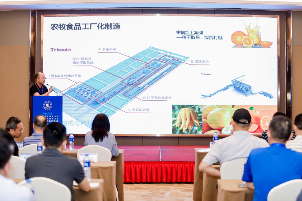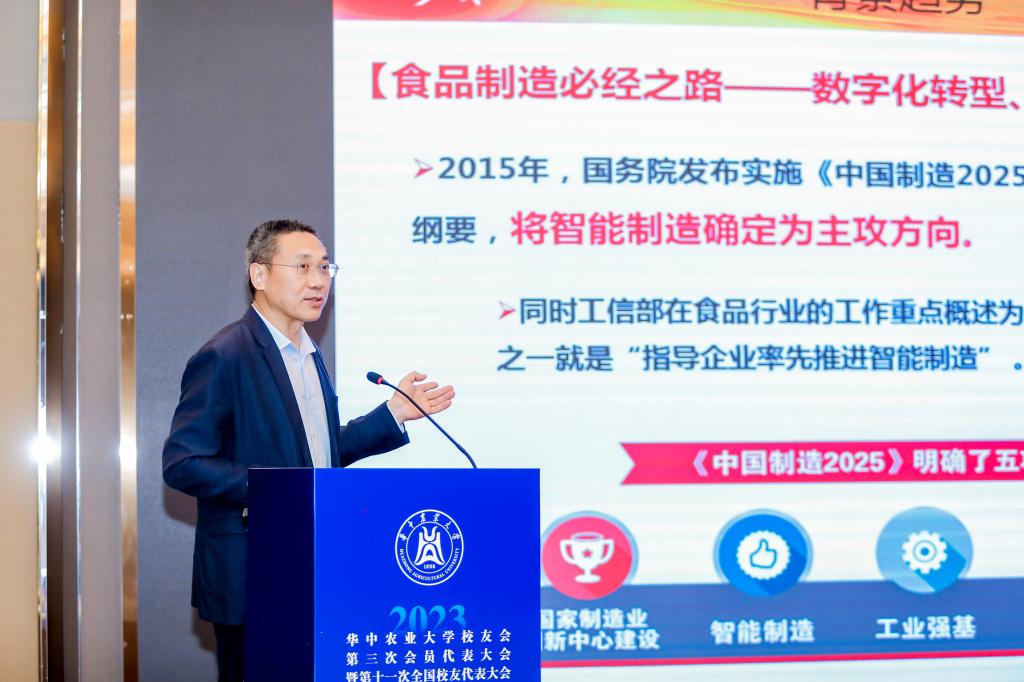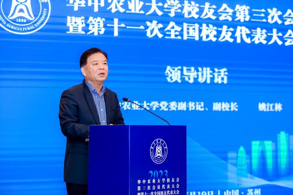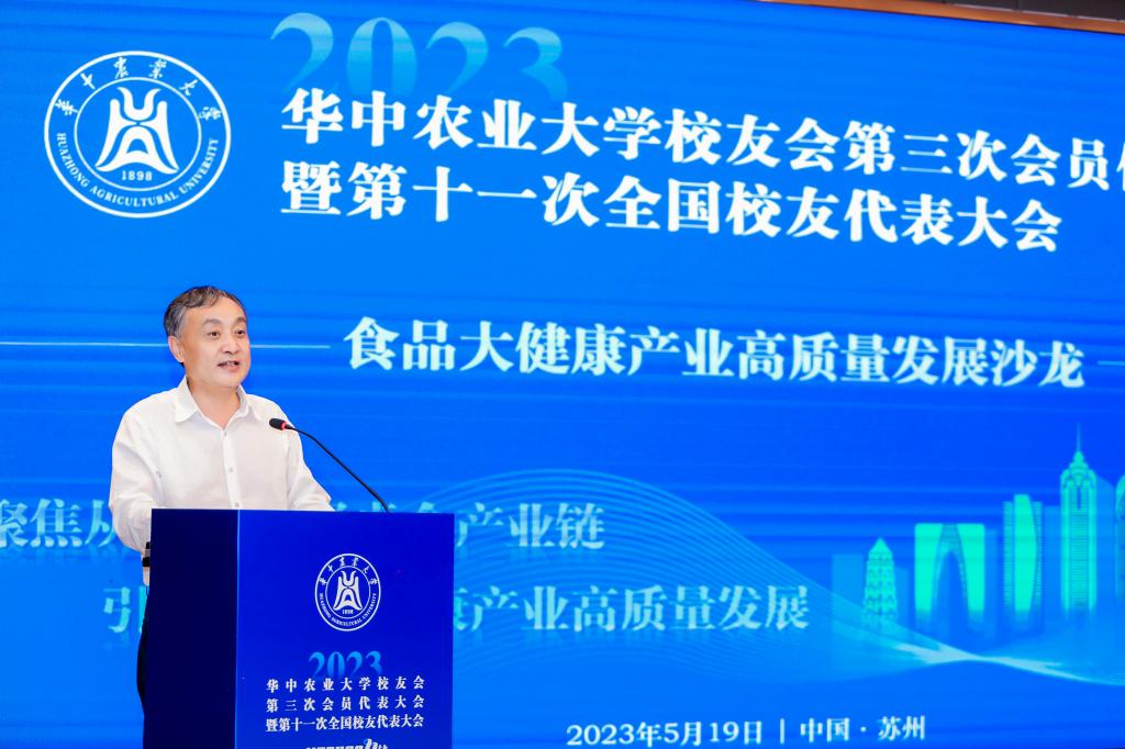 校党委副书记、副校长姚江林代表学校和校友会对参会校友表示热烈欢迎,希望大家常回华农看看,借助学院建院四十周年的机会重返母校深入开展交流合作。他表示,学校学院的事业发展离不开广大校友长期以来的关心和支持,食品科学技术学院作为学校工科的排头兵,无论是在人才培养、科技创新、社会服务、国际交流合作,以及文化传承和创新取得长足进步,这与广大食科人接续奋斗,全力拼搏密不可分。姚江林强调,学校对食品科学技术学院未来发展充满期待,全体食科人要把思想和行动统一到党的二十大精神上来,深刻把握和践行“大食物观”的内涵和要求,当好引领食品大健康产业绿色发展的排头兵,为吃得饱、吃得好、吃得健康提供强有力的科技、人才支撑和技术保障。