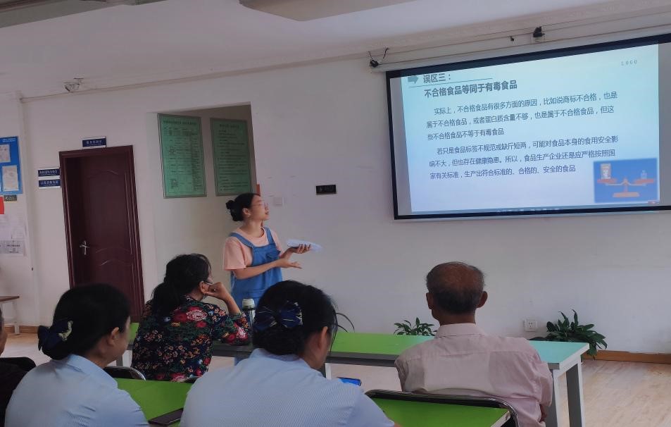 志愿者罗晓宇和单雨萌,首先为大家指出现在食品安全现状最主要的就是食品的质量问题,其中包括一些食品的污染导致食物中毒,还有食品中间搀假食品安全现状与事故。其次列举了几例家庭中常见的食物中毒事件,比如:米酵菌酸“酸汤子”事件,亚硝酸盐、黄曲霉毒素、龙葵素食物中毒事件等。紧接着介绍了各类食品安全消费误区,比如纯天然食品并不一定就是安全的,含有人工食品添加剂的食品并不一定不安全;最后为如何选择安全食品提供了多条建议。从而极大提升了居民日常生活中的“大健康”食品意识。