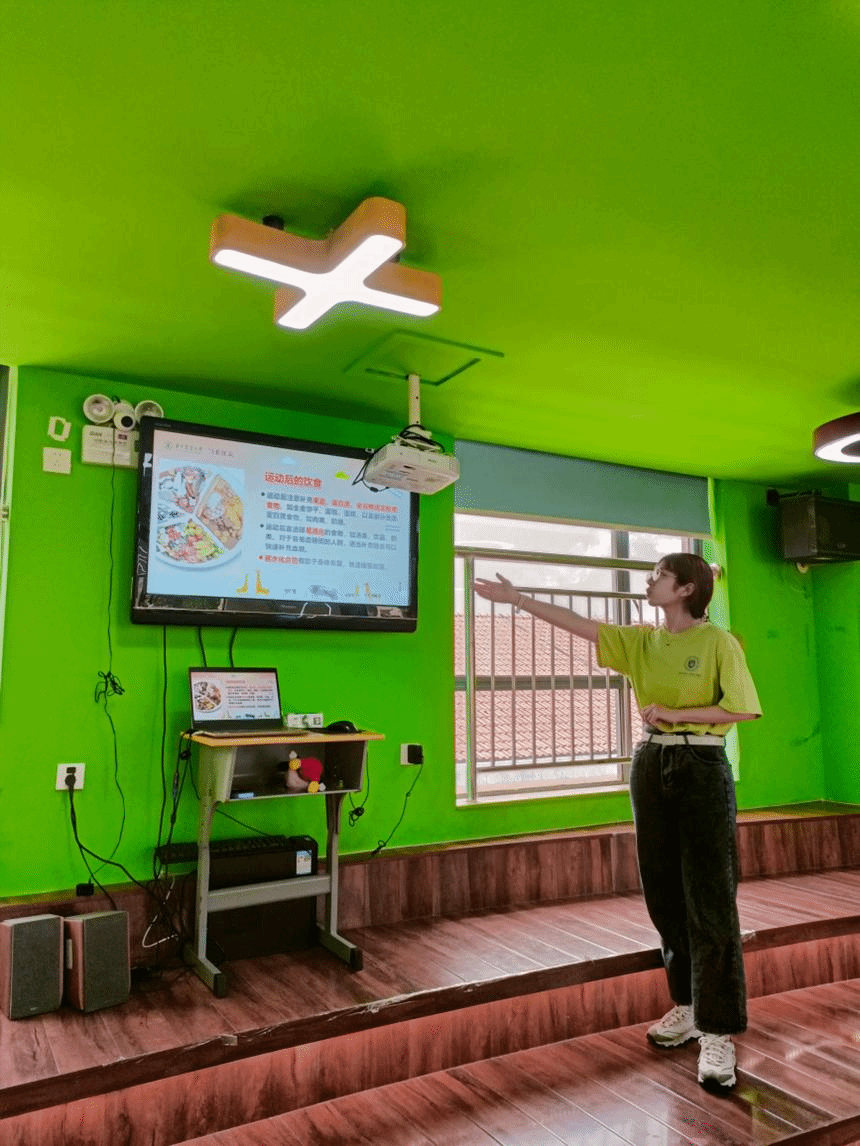 正值暑假期间,同学们会结伴游玩,志愿者结合现实情况,为同学们提供了运动后健康饮食的建议。“同学们在运动后要注意补充果蔬、蛋白质、全谷物或淀粉类食物,运动后要选择易消化的食物如汤类、奶类等。”