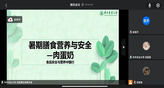 民以食为天。从粮食安全观到大食物观的转变,是我国居民消费结构升级的大趋势使然。过去的食物主要是“主粮”,而随着生活水平的提高,老百姓逐渐转,更青睐丰富多样的菜果茶、肉蛋奶等“副食”。为了普及食品安全知识教育,进一步促进食品安全知识深入市民层面,提高食品安全防范意识,增强全社会食品安全共管共治,8月3日上午,应城市场监督管理局联合中国·太阳集团tyc33455(股份有限公司)“食品安全与营养”中国行博士科普团团队,通过腾讯会议PPT宣讲的方式开展了一场以“暑期膳食营养与安全——肉蛋奶” 为主题的食品安全科普宣讲活动。应城市场监督管理局号召应城市社区市民共同参与了此次活动。
