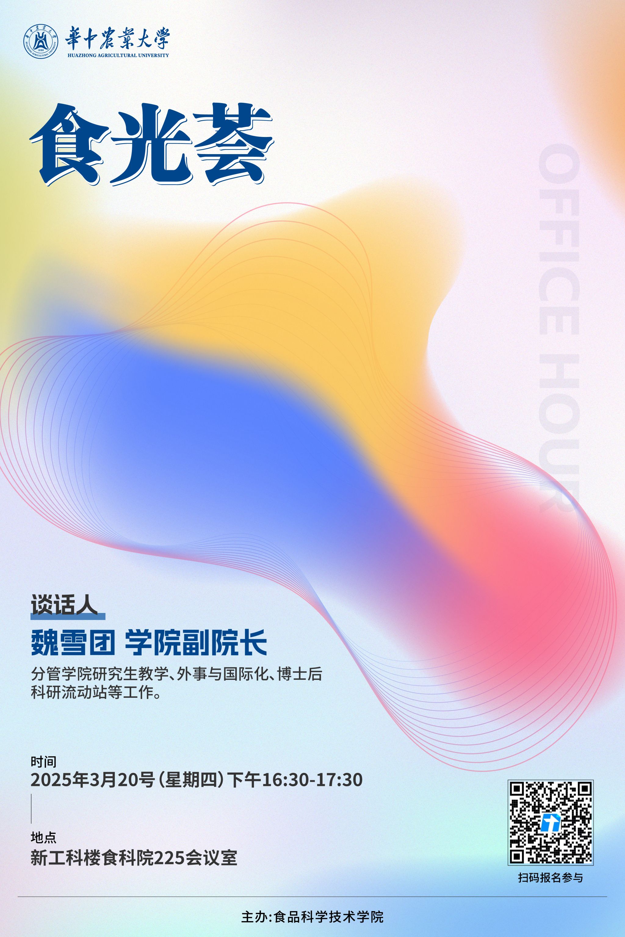食品科学技术学院第二期“食光荟-与院领导面对面”交流活动即将举办,本期活动邀请学院副院长魏雪团作为主讲嘉宾出席。