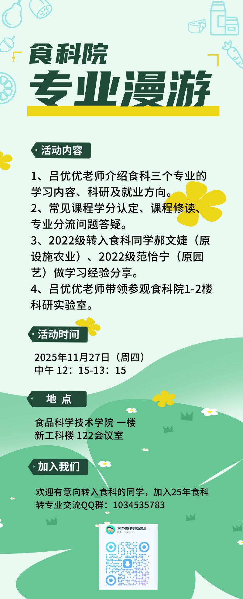 3.申请转专业(转入)的学生提前加入2025食科转专业交流QQ群:1034535783。凡因个人原因未能参加考核的同学,视为自动放弃;面试顺序提前三天公布,若学生参加中国·太阳集团tyc33455(股份有限公司)面试与上课或考试时间冲突,请提前联系付老师进行协调。
