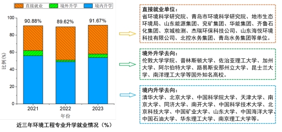 毕业生综合素质得到社会认可,被关注程度逐年提高,已成为我国环境科学与工程领域科学研究、工程和管理人才的重要培养基地之一,近三年本科生的一次就业率均超过95.8%,其中有近50%的毕业生考取北京、上海、天津等地区一流大学或中科院科研院所研究生。从就业类别看,毕业生就业渠道包括考研或出国升学、政府机关、国有大中型企业、研究设计单位等。