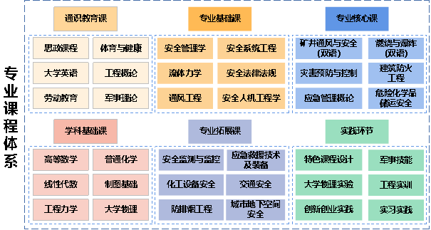 本专业培养德智体美劳全面发展,掌握必需的自然科学、工程技术等基础知识,系统掌握安全科学与应急管理基础理论、专业知识、基本技能,具有丰富的工程实践经验、创新创业能力和国际化视野,能在政府应急管理部门、安全设计与评价机构以及地下工程安全、化工安全、消防安全、应急管理等方向及所涉行业领域从事安全工程技术开发与设计,安全检测与评价、安全监察与管理、安全培训、应急救援等工作的高水平应用创新型人才。修业年限标准学制为4年,修完专业培养方案规定内容,学分修满172学分,准予毕业并授予工学学士学位。
