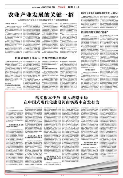 7月26日,《河南日报》在第04版以《落实根本任务 融入战略全局 在中国式现代化建设河南实践中奋发有为》为题,刊登了校党委书记刘永涛、校长李利英署名文章。