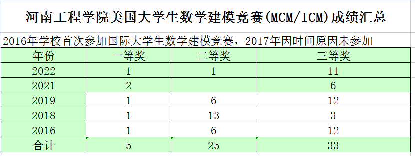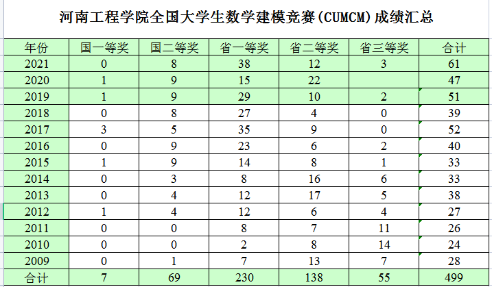 近年来,通过数学建模协会宣传,参与选拔、培训的学生在“高教社”杯全国大学生数学建模竞赛中,获全国一等奖 9 项、二等奖 75 项,获河南赛区一等奖 249 项;在国际大学生数学建模竞赛,获国际一等奖 6 项,二等奖 26 项,尤其是 2020 年获奖等级及获奖比例在全国 1490 所参赛院校中排名前 20 位,在河南省高校中位居第 2 位;2020 年共获国家一等奖 1 项、国家二等奖 9 项,河南省一等奖 15 项,河南省二等奖 22 项,国家奖获奖总数在全国近 1470 所高校中排名第 16 名,在河南省高校中位居第 1 名。在 2022 年度第 38 届美国大学生数学建模竞赛中,我校参赛的 11 支队伍全部获奖,其中国际一等奖 1 项,国际二等奖 1 项,国际三等奖 9 项。近年来数学建模成绩一直位于在河南省高校前列。
