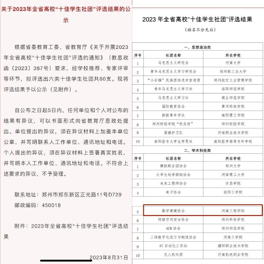 根据省委教育工委、省教育厅《关于开展2023年全省高校“十佳学生社团”评选的通知》(教思政函〔2023〕387号)要求,经学校推荐、专家评审等环节,共评选出六类十佳学生社团共60支。我校数学建模协会评选为全省高校学术科技类“十佳学生社团”。