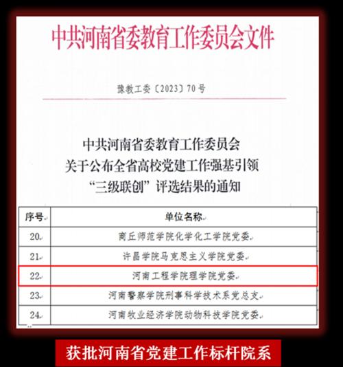 2023年3月河南工程学院理学院党委获得首批河南省党建工作标杆院系培育创建。自创建以来,理学院党委坚持以习近平新时代中国特色社会主义思想和党的二十大精神为指引,坚持“党建引领+事业发展”的工作理念,坚持以标准化、规范化、特色化、品牌化和成果化为目标,坚持实施“基础夯实”“品牌打造”“先锋引领”三大工程,通过重点培育、持续提升和整体打造,形成集学科优势和理学特色于一体的“四品牌两体系” 党建工作机制。