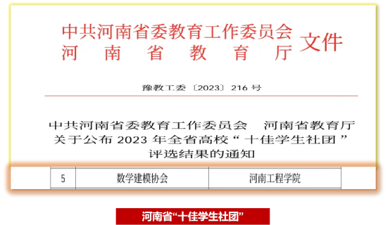 打造数学文化育人品牌。实施竞赛驱动“三融三师”渐进式创新人才培养体系、反馈导向“一纵一横”数学建模竞赛课程培训体系、师生共进“三平台十工作”数模竞赛管理体系,形成以全国大学生数学建模竞赛为龙头的数学文化育人品牌。在全国大学生数学建模竞赛中,获国家二等奖9项、省一等奖23项,总体获奖率94.64%,获奖率位居河南省高校前列。数学建模协会荣获河南省“十佳先进社团”。