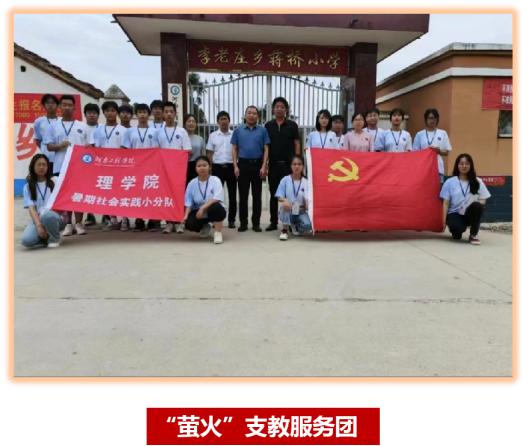 打造社会实践育人品牌。组织 “萤火”和 “皓月”两支服务团暑期赴周口市沈丘县蒋桥小学开展为期14天支教,打造以支教为主题的社会实践育人品牌。支教活动受到社会广泛关注,当地媒体以“传承七彩课堂”为题进行专题报道。