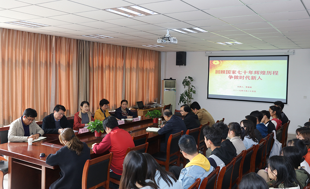 李春英以《回顾国家七十年辉煌历程,争做时代新人》为题,以确立社会主义基本制度,实行改革开放,进入社会主义新时代为主线,回顾了新中国站起来、富起来、强起来的伟大历程。她对作为新时代青年的广大同学们提出了三点要求和希望:一是要志存高远、忠于祖国,努力做新时代具有远大理想和坚定信念的爱国者;二是要应敢于担当、勇于奋斗,努力做新时代具有责任意识和创新精神的建设者;三是要应勤奋学习、锤炼身心,努力做新时代具有过硬本领和高尚品格的接班人。人事处处长徐丽萍以社会主义市场经济体制的建立及发展为主题,为在场师生进行了讲解。