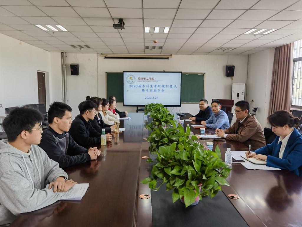 2023年全国硕士研究生考试复试环节正陆续开展,为让考生熟悉复试流程、获得理想成绩,3月28日下午,经济贸易学院在9B316-317举行考研模拟复试暨专家指导会,特邀河南财经政法大学金融学院副院长孙书章、国际经济与贸易学院副院长任保显、我校教务处课程中心主任杨凌云教授组成复试考官团队。会议由副院长安乾主持,研考上线考生参加了模拟复试并接受了专家指导。