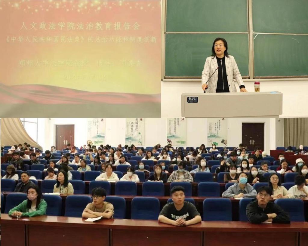 为切实加强法治教育,增强广大师生的法治意识,提升师生法治素养,4月12日下午,人文政法学院邀请郑州大学法学院郭德香教授在九号楼道德大讲堂为师生作了题为“中华人民共和国民法典的法治功能和制度创新”的辅导报告,法学教研室教师和法学专业学生参加报告会。报告会由院长徐金超主持。