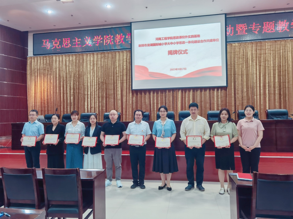 为推进大中小学思政课一体化建设,切实发挥思政课立德树人关键课程作用,全面增强思政育人效果。5月17日下午,河南工程学院思政课校外实践基地、新郑市龙湖国际城小学大中小学思政一体化建设合作共建单位揭牌仪式在河南工程学院举行。马克思主义学院院长、副院长、马院全体教师、新郑市龙湖国际城小学时晓玉校长及教师代表参与此次活动。